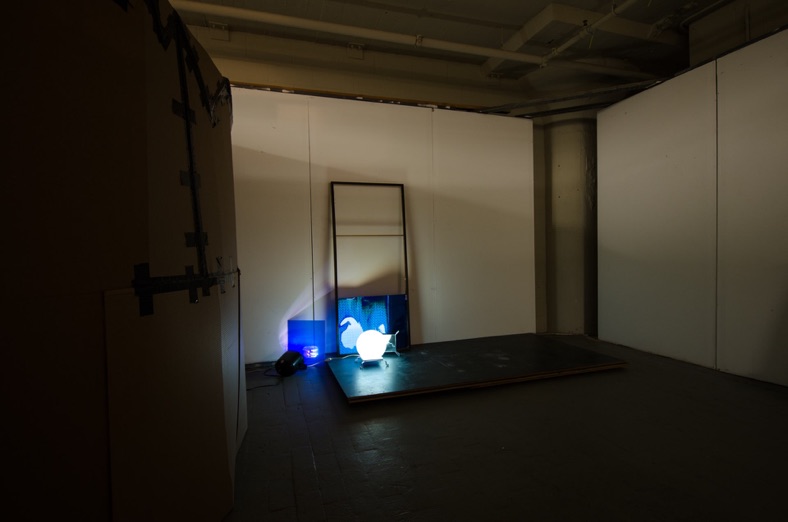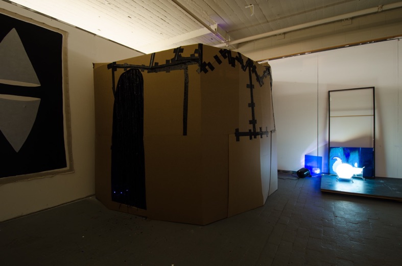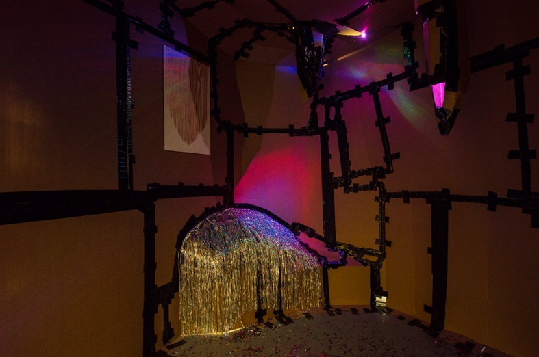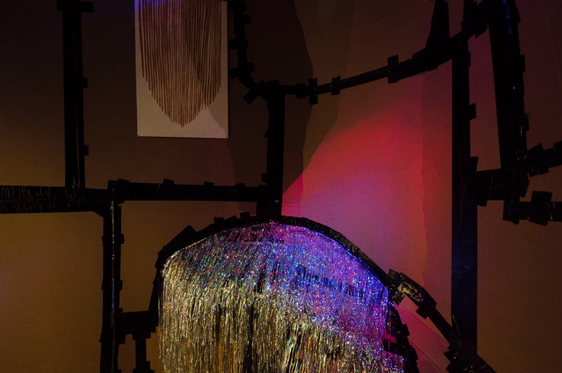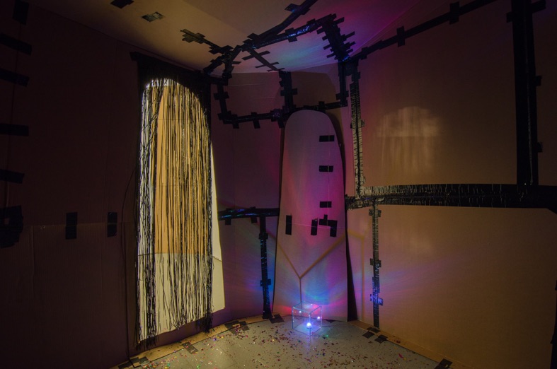 Untitled, 2013. materials: cardboard, duct tape, tinsel, strobe lights, theatre gels, glass, metal, wood, holographic gift wrap, clear acrylic, colored led bulbs, and rgb led lights.