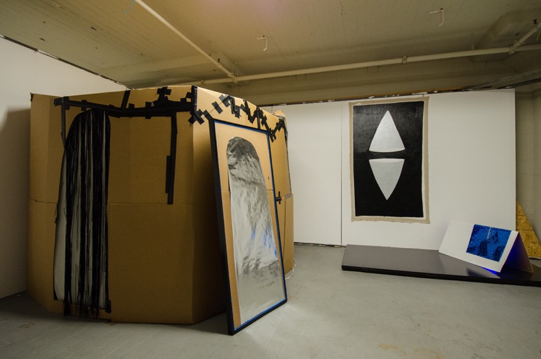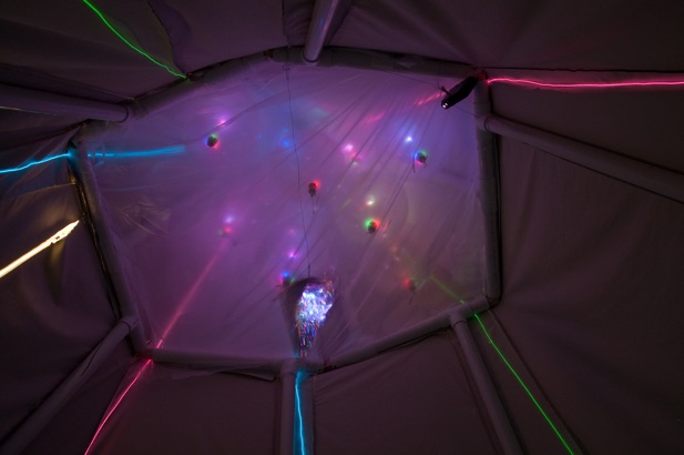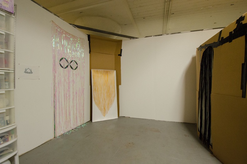 Untitled, 2014. materials: cardboard, duct tape, tinsel, paper, acrylic, high gloss enamel, theatre gels, wood, holographic gift wrap, reflective gift wrap, black light, el-wire battery operated lights, colored led bulbs, and rgb led lights.