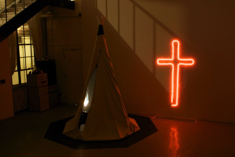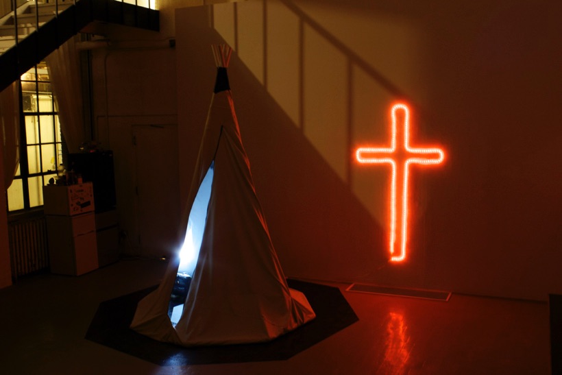 <TIPI> 2011. material: blackout fabric, duct tape, pvc, rope light, hanging door mirror, and projected video. dimensions: installation, size variable
