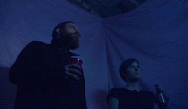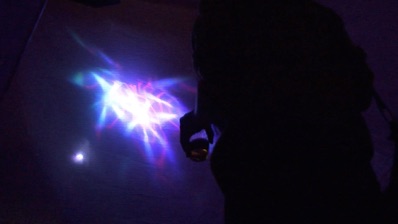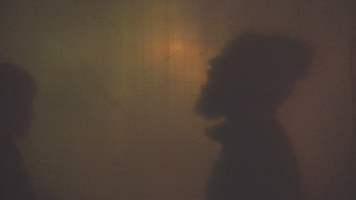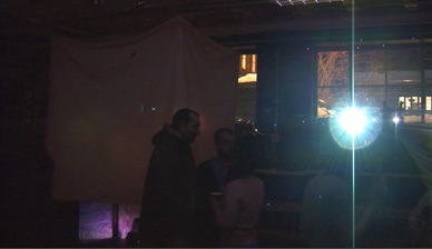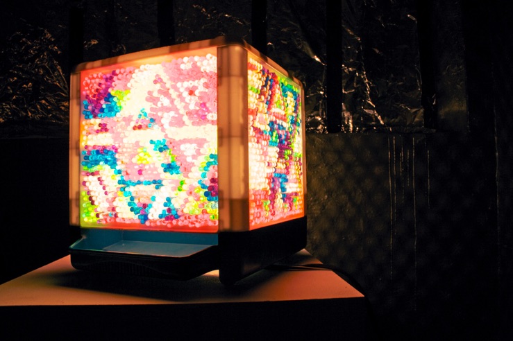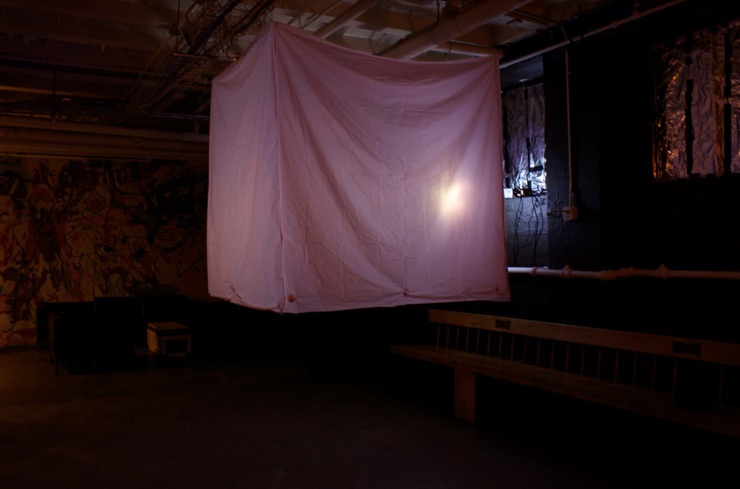 Untitled (dance cube), 2011. materials: shower curtains, monofilament, bright lite, and projected video. dimensions: 8 x 8 x 8’