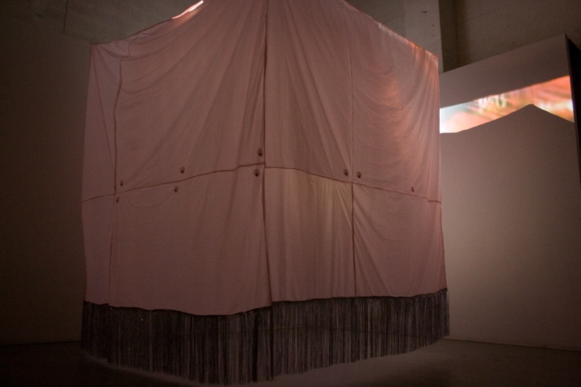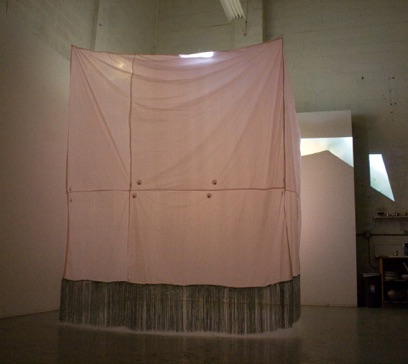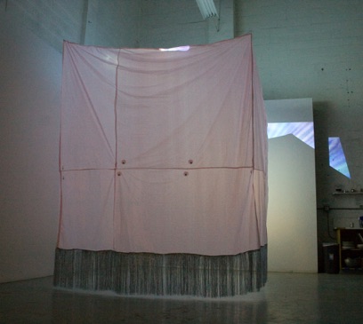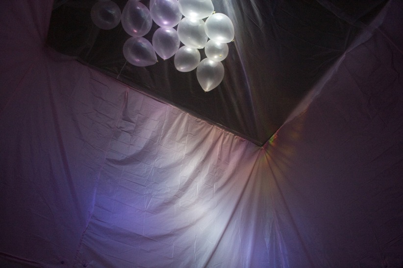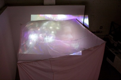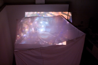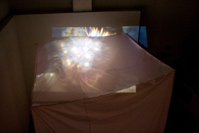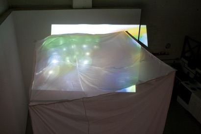 Untitled (floating cube), 2011. materials: shower curtains, tinsel, monofilament, clear latex balloons and projected video. dimensions: 10 x 10 x 14’